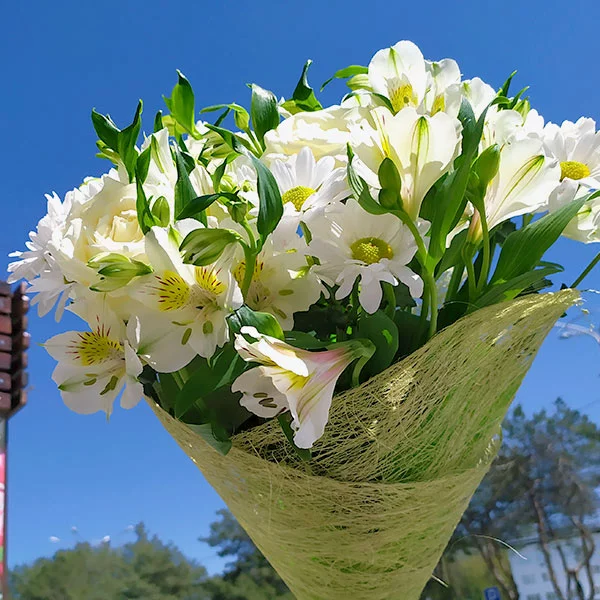 ДЕЛЮКС: хризантема кустовая ромашковая - 15 шт, фрезия/альстромерия белая - 10 шт, альстромерия белая - 14 шт, салал, фетр зеленый, натуральная упаковка.