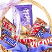 ДЕЛЮКС: роза красная (70 см) - 3 шт., Twix - 4 шт., Snikers (маленький) - 4 шт., Picnic - 3 шт., шоколад "Milka" - 2 шт., декоративная зелень, корзина средняя, фетр фиолетовый, бант сиреневый.