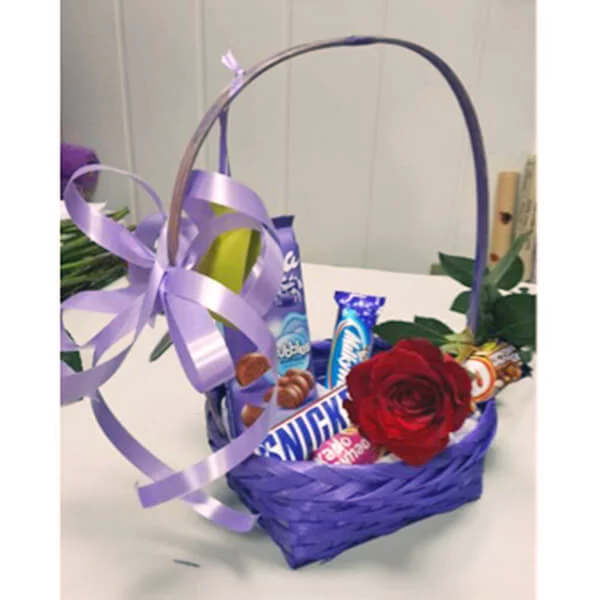 ЛЮКС: роза красная (70 см) - 1 шт., Twix - 4 шт., Snikers (маленький) - 4 шт., Picnic - 2 шт., шоколад "Milka" - 2 шт., декоративная зелень, корзина малая, фетр фиолетовый, бант сиреневый.