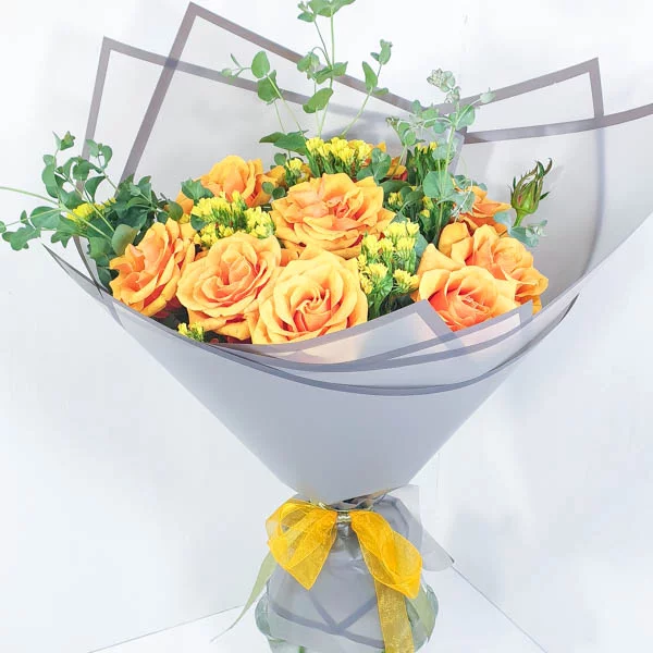 роза желто-оранжевая (50-60 см), декоративная зелень, упаковка, лента