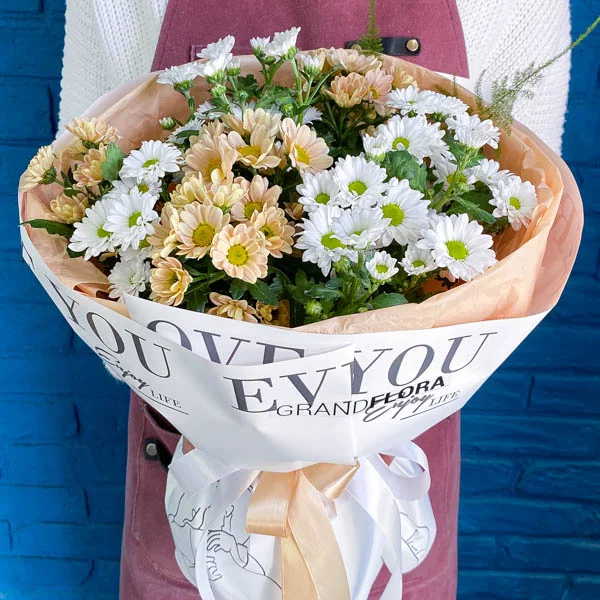 15 хризантем: хризантема кустовая белая (ромашковая) - 8 шт., хризантема кустовая кремовая (возможна замена на розовую)  - 7 шт.,  упаковка, лента